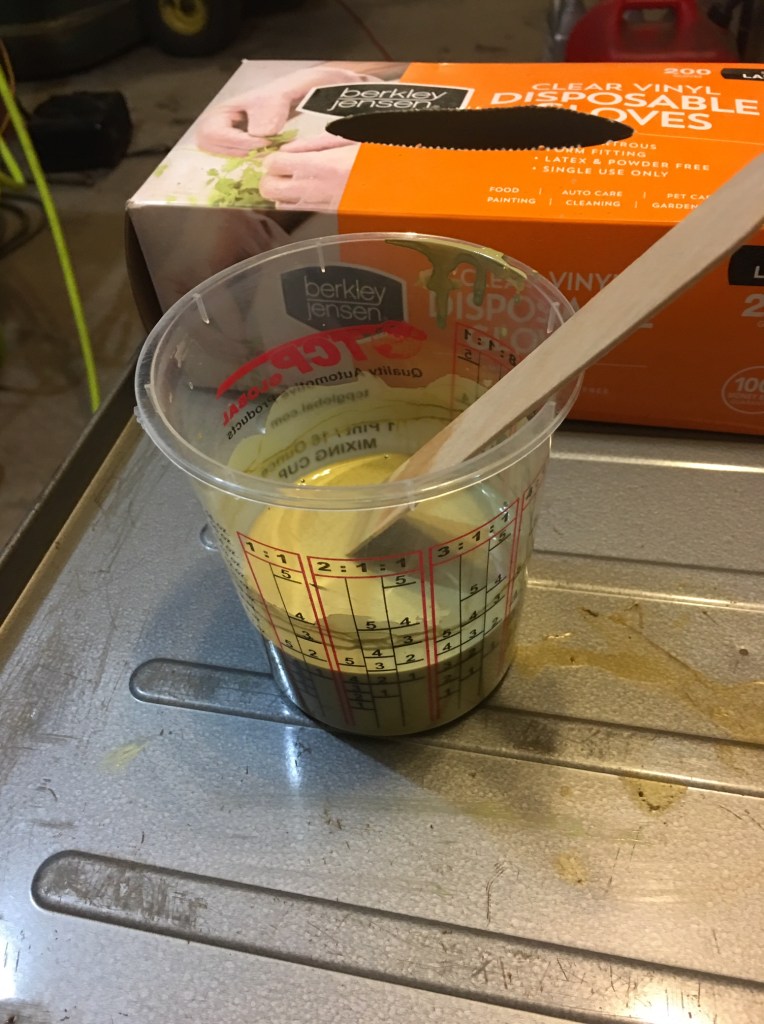 In this work session, I finally got to shoot some primer with my downdraft table. I did a small batch of parts to get a feel for how the spray gun works and how much primer is needed for a particular set of parts. I started by mixing a small amount of primer base and an equal amount of curing solution. This mixture needs to sit for 30 minutes before it’s used.