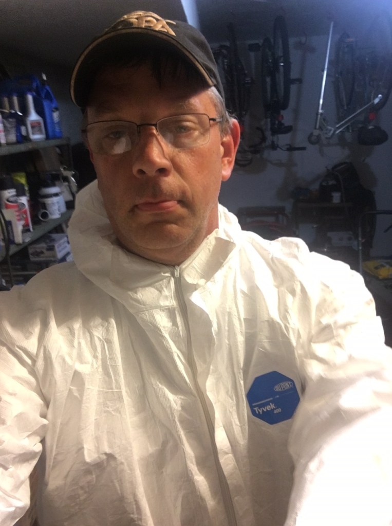 I suited up for spraying. I’m wearing a full Tyvek suit and I have a full-face respirator to protect my eyes and lungs.