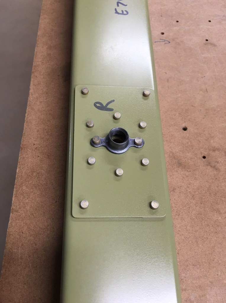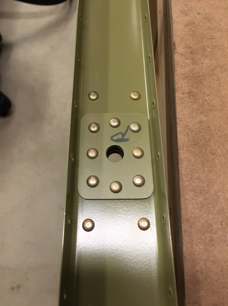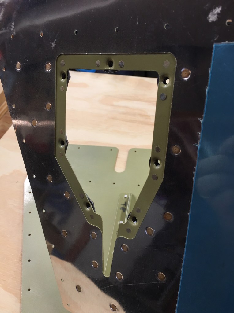 The trim tab access cutout is reinforced with a reinforcement plate which has nut-plates riveted in place so the exterior access panel can be held with screws. Nut plates are threaded “nuts” that are permanently riveted so no tool is needed to hold them in place while screws are fastened. This allows for a nice flush cover that can be removed for maintenance and inspection purposes.