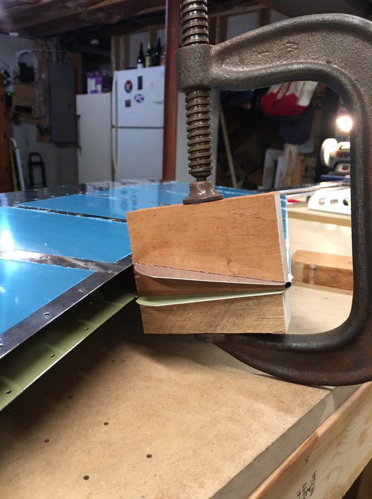 The folded trailing edges need to be carefully bent down to their final angle prior to assembly. For this, I am using a bending brake made from a pair of 2x6s connected by door hinges: