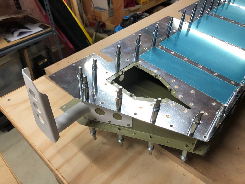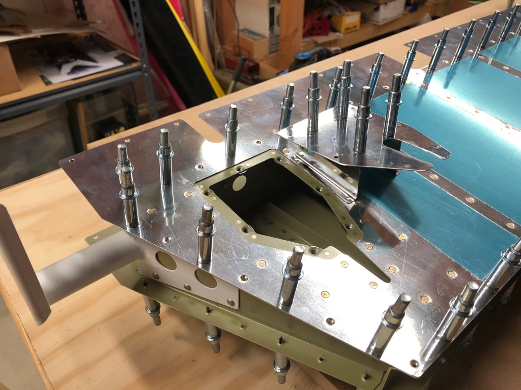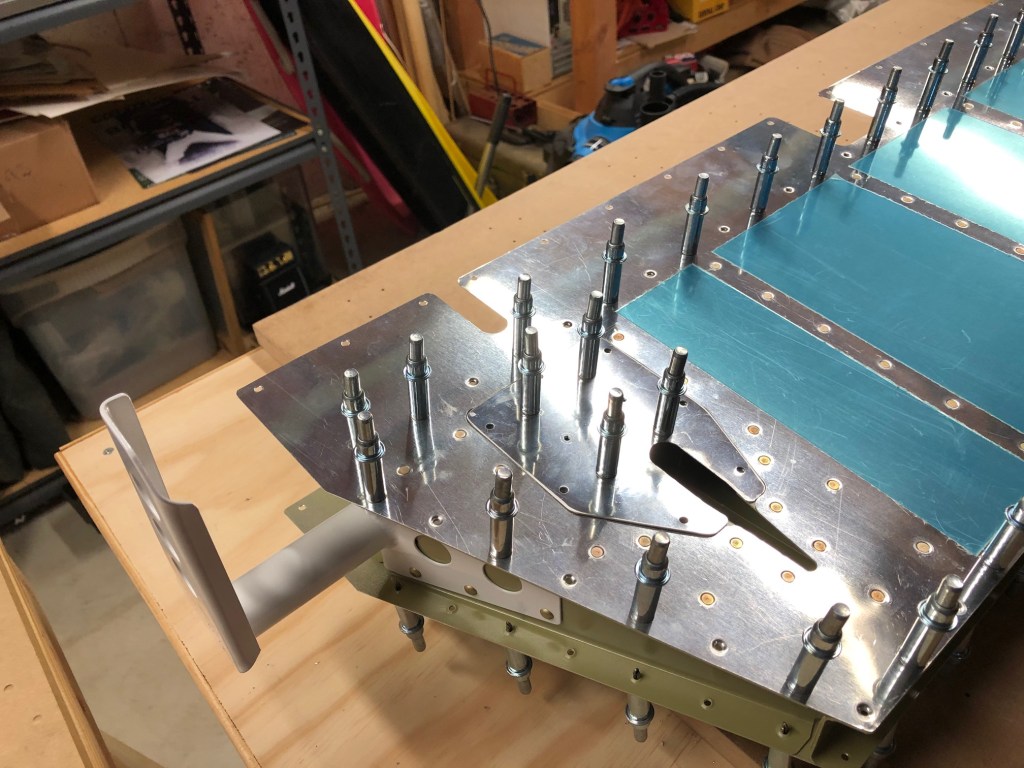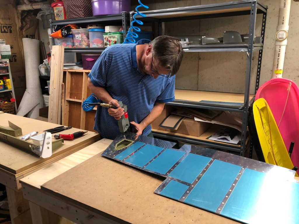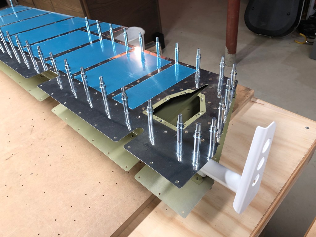 This evening I worked on preparation for the assembly of the left elevator. All of the rivet holes on the skin needed to be deburred and dimpled. Here’s me using the pneumatic squeezer to dimple the rivet holes around the edges of the elevator skin: