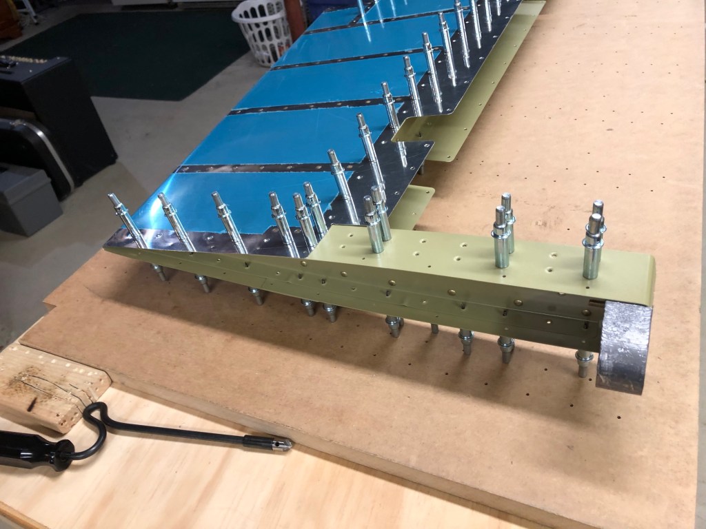 I also needed to expand the holes on the leading edge to #30 (1/8″) to accomodate the 1/8″ blind rivets that hold the curved leading edges together. Here are some pictures from this session, mostly of the assembled elevator held together by clecos.