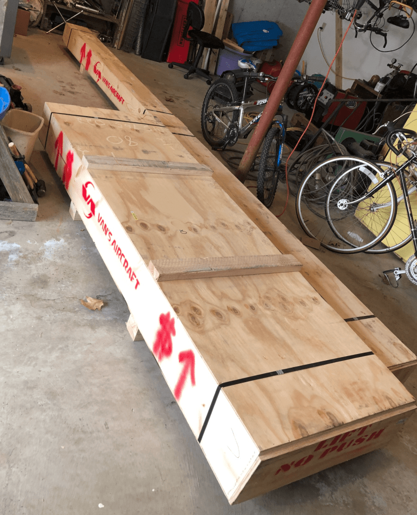 My RV-7 wing kit has arrived. It was shipped by truck and delivered by a subcontractor with a truck with a hydraulic lift. Apparently this is how they handle residential deliveries, i.e. deliveries to locations that don’t have forklifts.