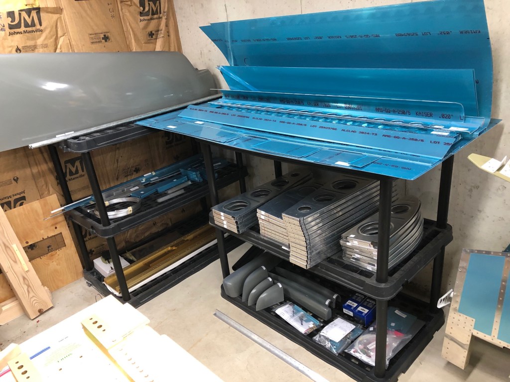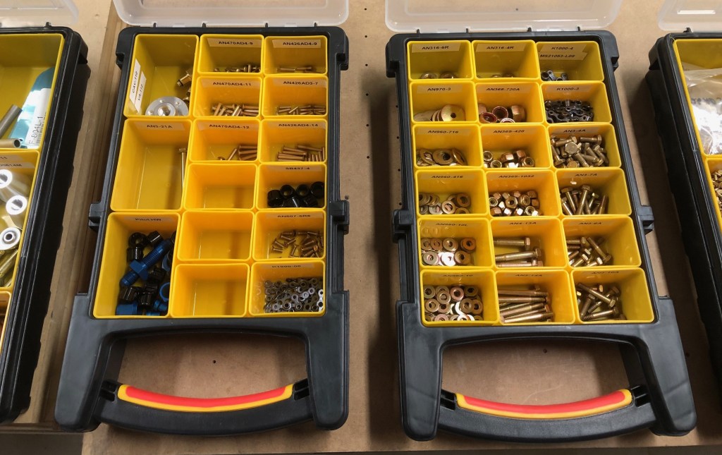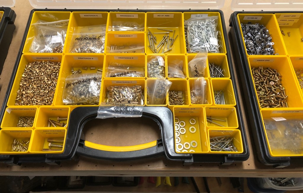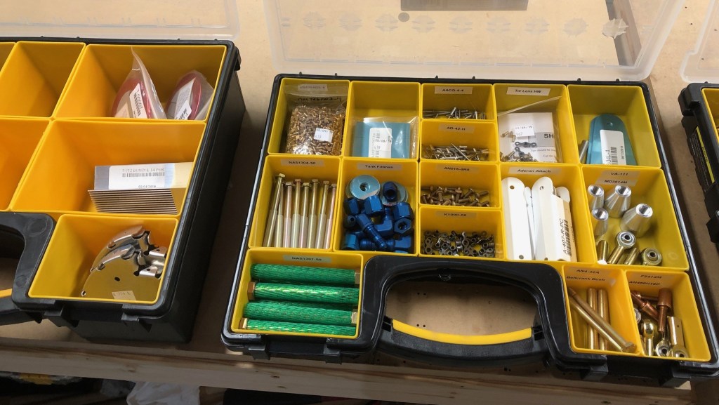 I’ve organized the parts in compartmentalized storage cases so I can easily find everything when I need it. There are a lot of different rivets, bolts, washers, screws, and nutplates. There are also interesting things like drain fittings, fuel tank caps, pipes, tubes, and pushrod hardware.
