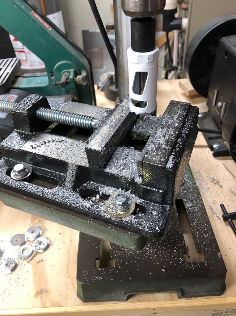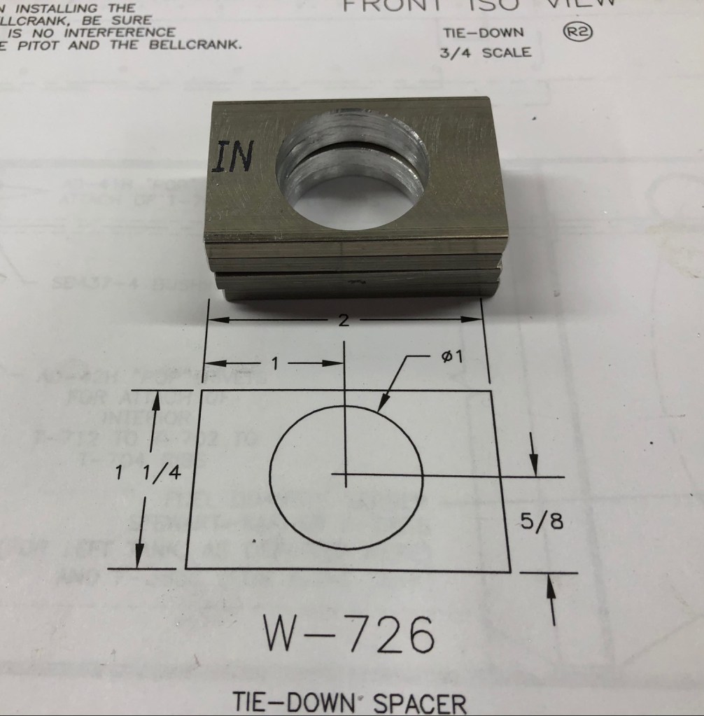 The tie down bars need to be drilled and tapped and their spacers fabricated. The spacers are cut from an aluminum bar with a one inch lightening hole cut in the middle. It is called a lightening hole because it reduces the weight of the part.