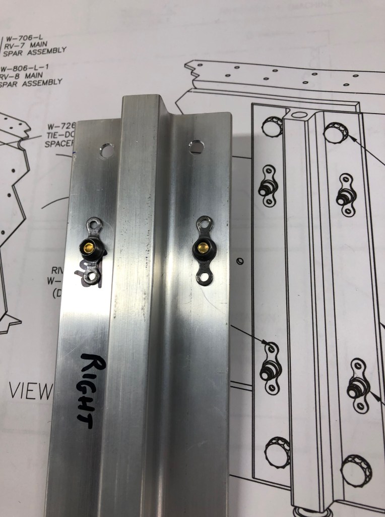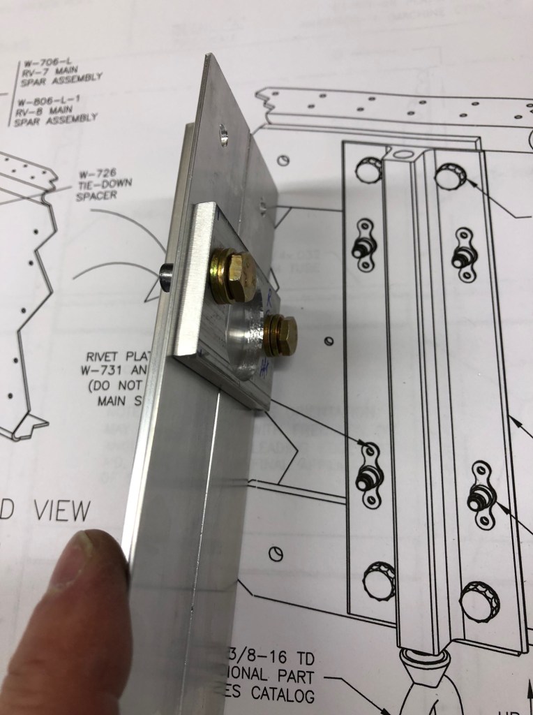 Once the tie-down bar and the spacers are drilled to match the spar, the bar and the spacers need to be drilled for the platenuts that will hold the aileron bellcrank brackets.