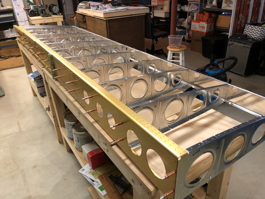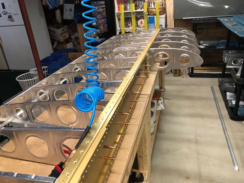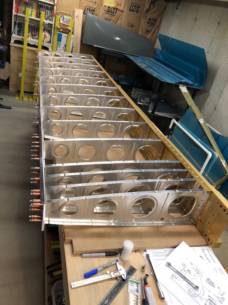 This evening I assembled the left wing skeleton (main and rear spars to the ribs) and began final drilling the rivet holes for rib-to-spar attachment. It was inspiring to see the whole wing clecoed together. Here are some shots from this session: