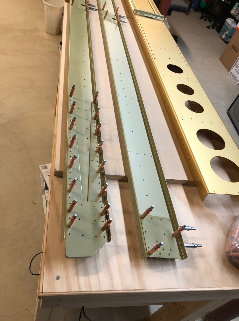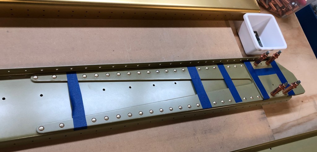 We had a day of warm (70F) weather during which I was able to get the rear spar components primed. This allowed me to start setting the first rivets on the wings. I need to rivet together the rear spar components to get ready for the building of the main sections of the wings.