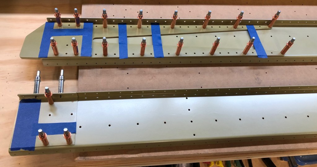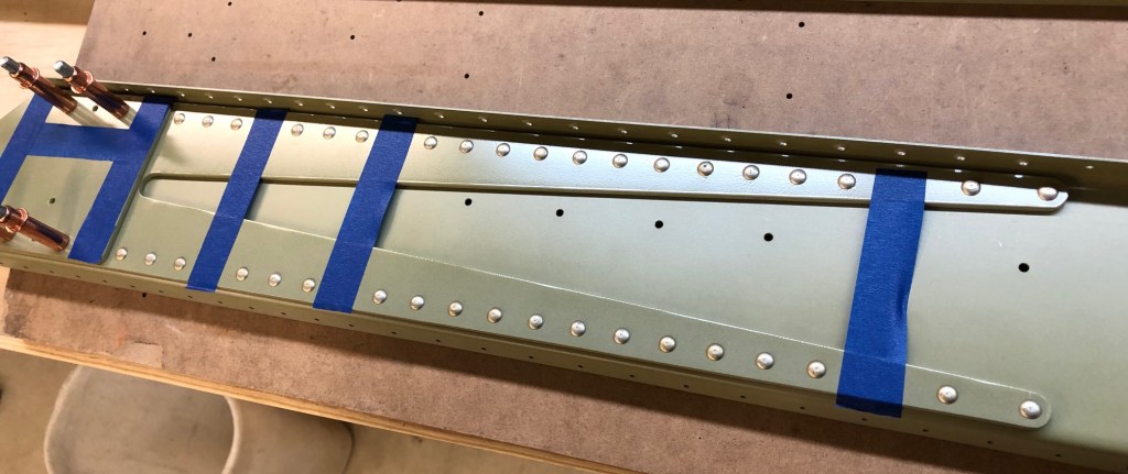 Many of the rivet holes in the rear spars are used to attach other wing components. The main ribs, the aileron hinge brackets, the aileron fairings, and the flap braces are all eventually riveted to the rear spars. It’s important when riveting the rear spar together that the holes needed for all of these attachments be left open for when they’re needed. I carefully identified all of the affected holes and put tape over them so I wouldn’t accidentally set a rivet in them.