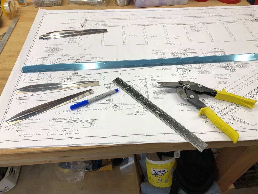 It’s too cold in my garage to prime the main ribs, so I’m going out of order to get some tasks completed that I will need later. In this session, I trimmed all of the stiffeners for the ailerons. These are just like the stiffeners in the rudder and the elevators, except they are all the same size. There are 32 of them that are cut from eight pieces of angle aluminum. They need to be cut, trimmed to fit in the narrow trailing edge of the ailerons, and smoothed and polished to remove any burrs or sharp edges.