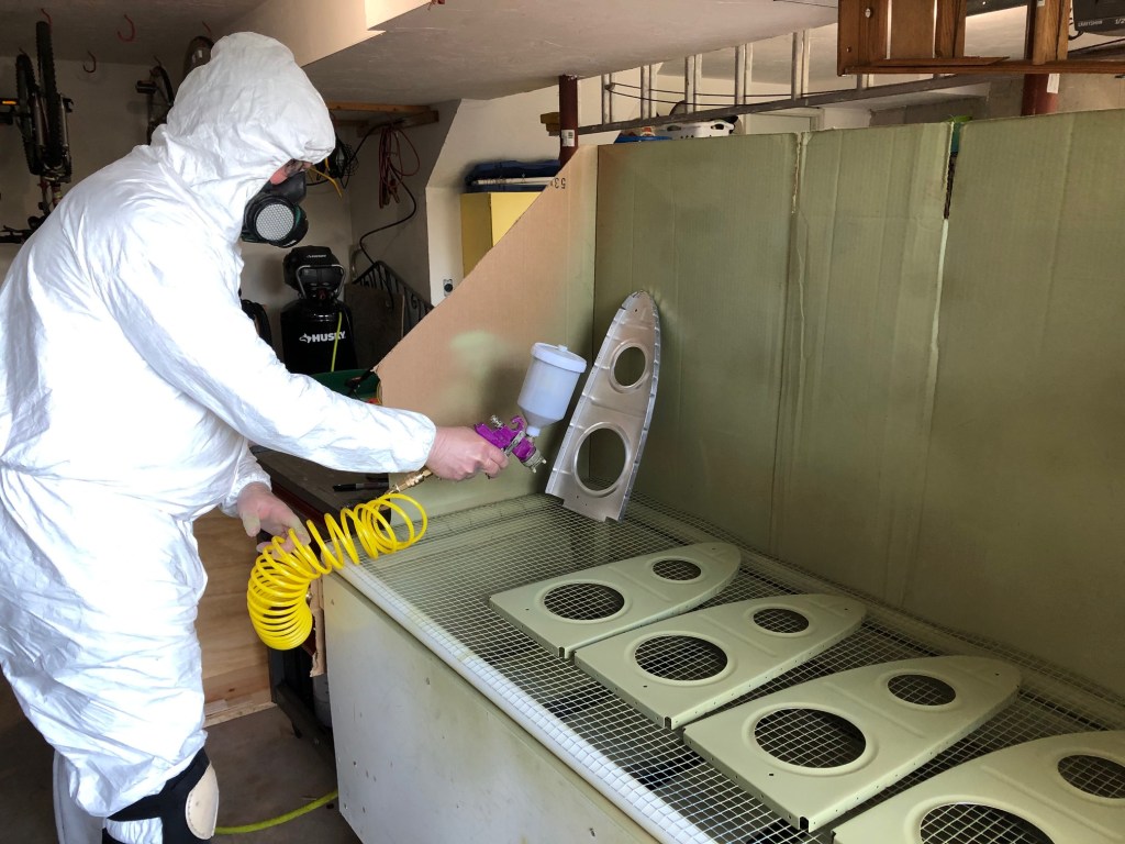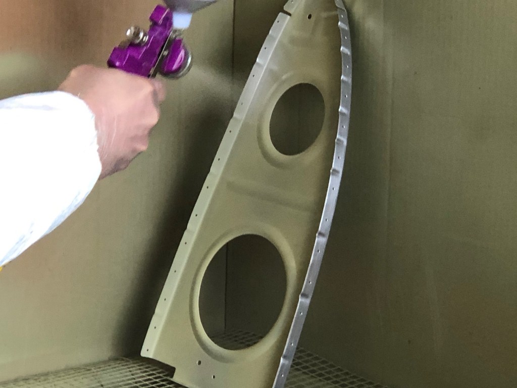 In this session, I primed all of the components of the left-wing leading edge, including the ribs and the inside surface of the skin. My wife took a couple of pictures of me shooting primer on the ribs.