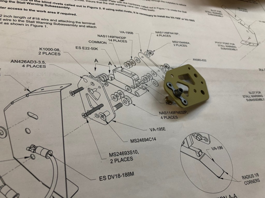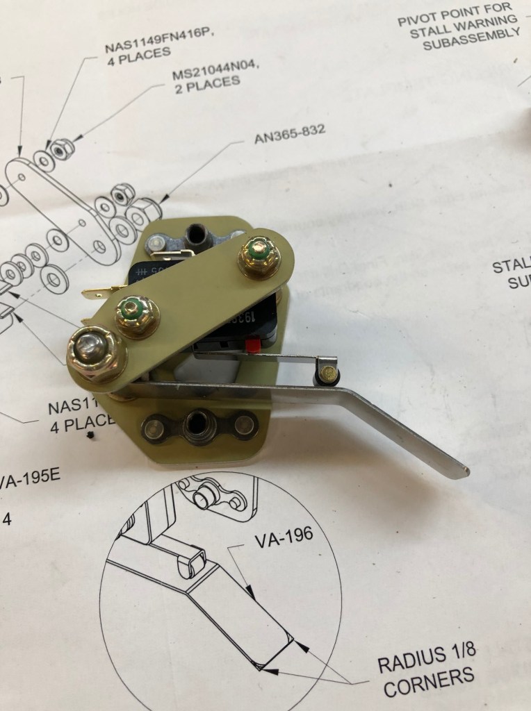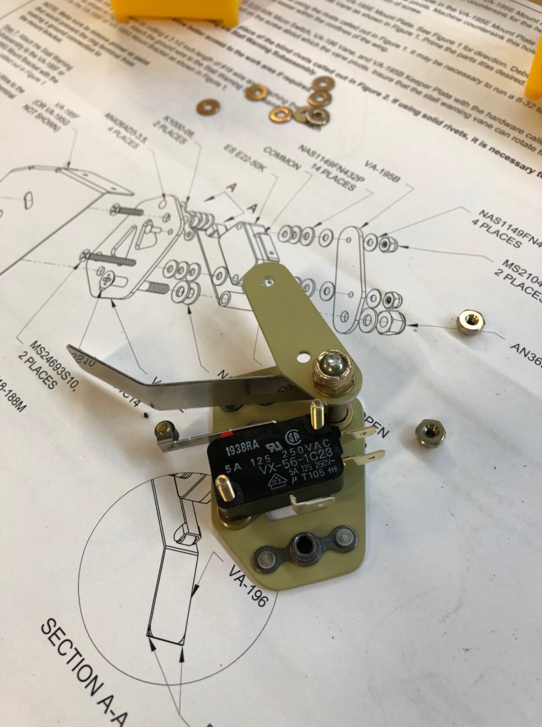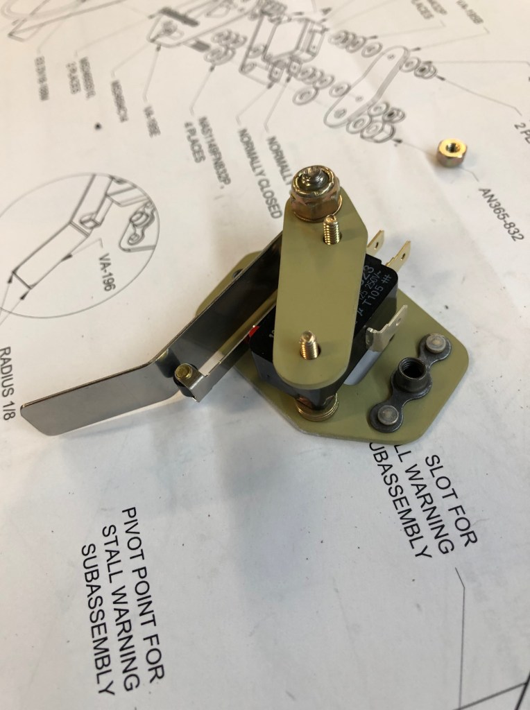 The stall warning vane is a unique part of the left-wing leading edge. There isn’t one on the right side. With the parts now primed, I was able to build the microswitch assembly for the stall warning. Here are a series of pictures showing the progress: