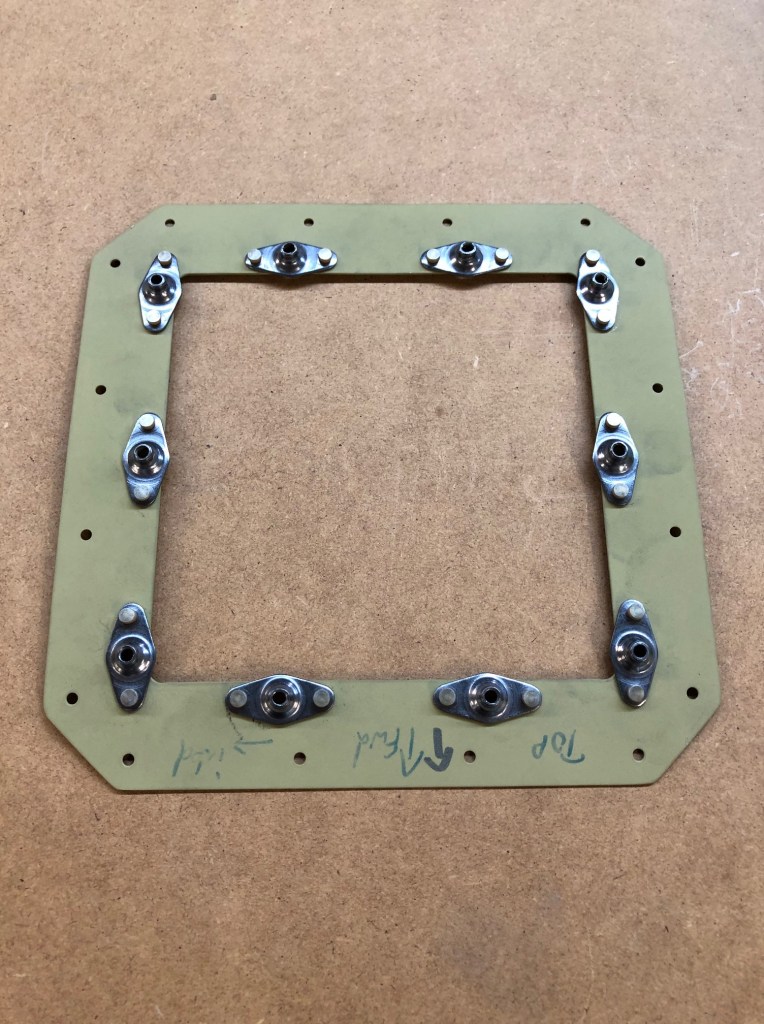 The last task in preparation of the stall warning is riveting the plate-nuts onto the access-plate-doubler that will go around the a square hole in the bottom skin. The plate-nuts are used to fasten an access panel to cover the hole. This panel may be removed after the airplane is completely built to gain access to the stall-warning assembly for inspection or maintenance.
