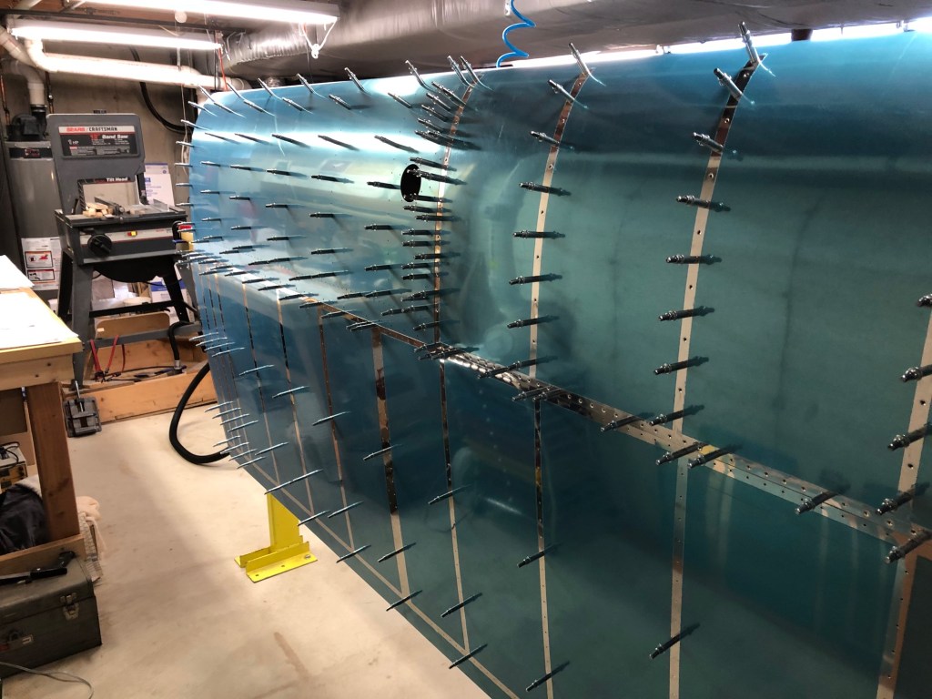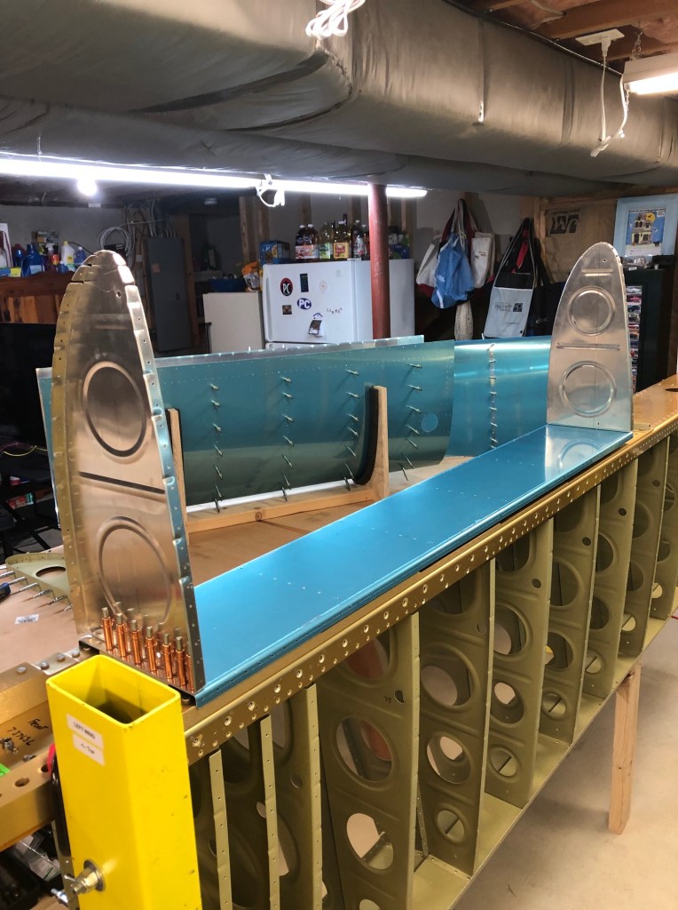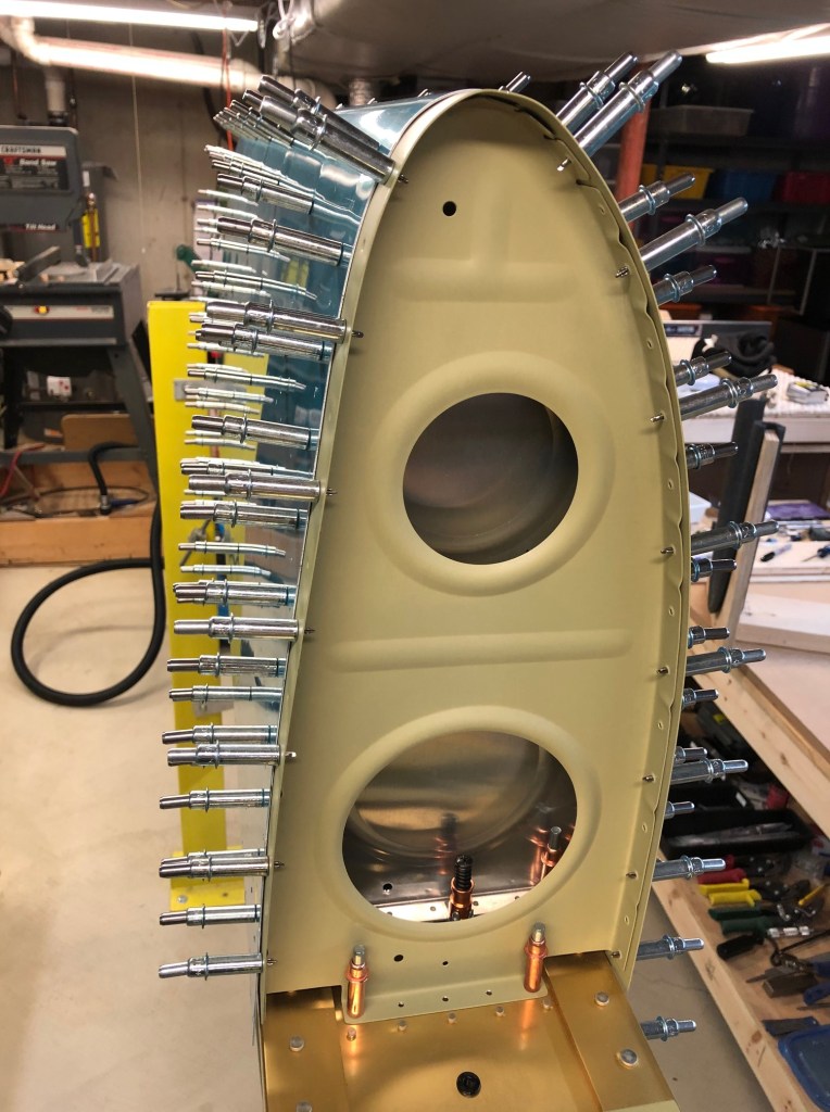 The reason for assembling everything together like this is to get the tank properly aligned with the spar and outboard leading edge. Once the alignment is established and everything is where it’s supposed to be, then the tank baffle is aligned to the Z-brackets and is ready for drilling.