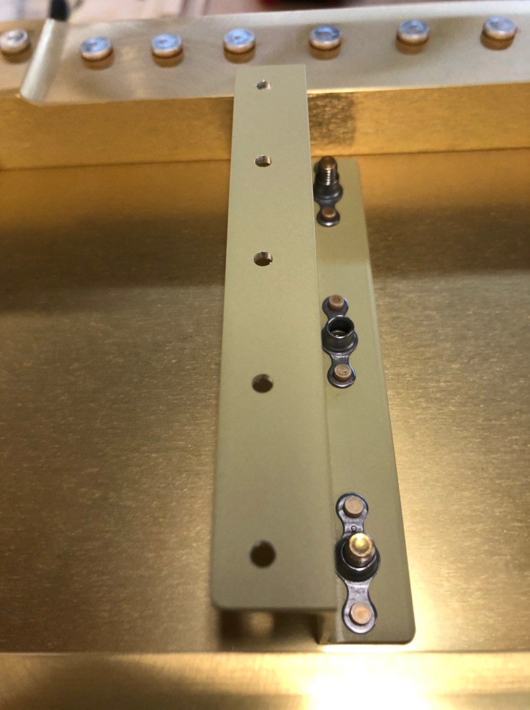 Note how the holes are slightly to the left of center, away from the Z-bracket web (the vertical component). This is by design and is a result of the way we originally located the screw holes as close as possible to the bracket web. These holes will be used to fasten the brackets to the tank baffle using blind (pulled) rivets. That extra space will be important in allowing room for the rivet puller point to fit behind the rivets. As it is, the rivet puller will still need to be modified to fit by grinding away some of the material on the point of the tool.